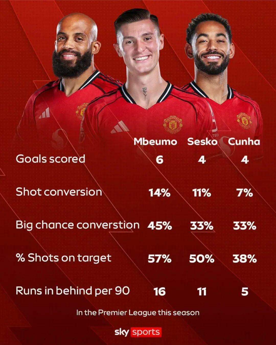 天空体育:姆伯莫,谢什科和库尼亚三人在英超联赛的数据