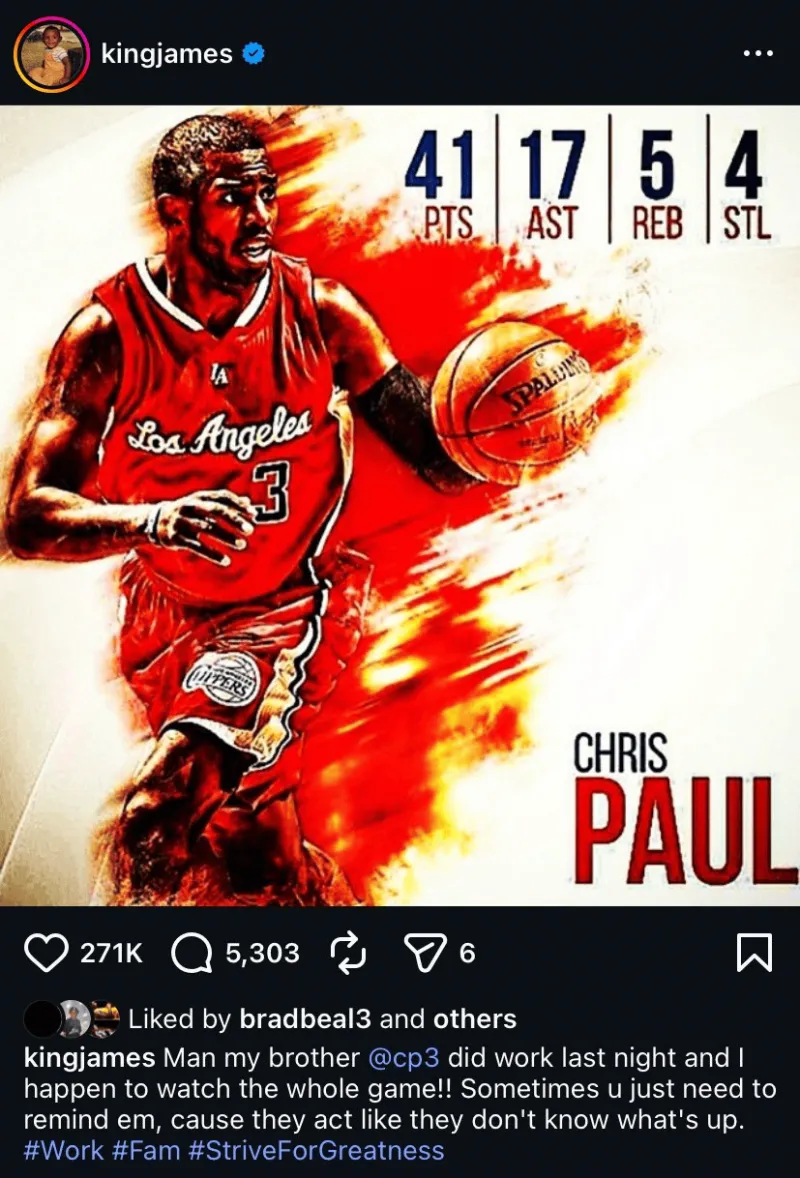 詹姆斯在保罗砍下41分17助攻后,社媒发文声援保罗:“我的兄弟克里斯-保罗昨晚表现太棒了,我恰好看了整场比赛!!有时候你得提醒他们一下,因为他们那副样子,好像根本不知道发生了什么。”